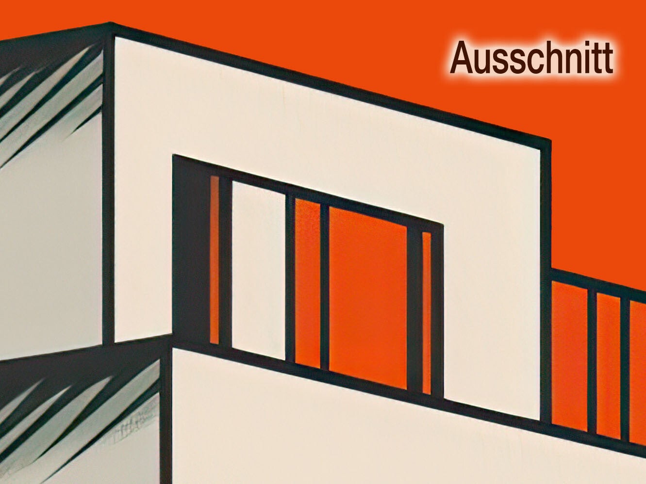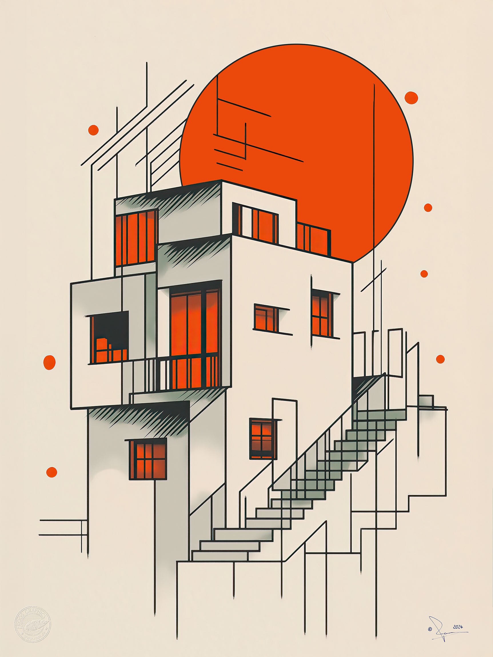 Abstraktes Architekturmotiv, Bauhaus-Ästhetik mit warmen Farbtönen. Ideal für zeitgenössisches Wohnambiente oder Büros.