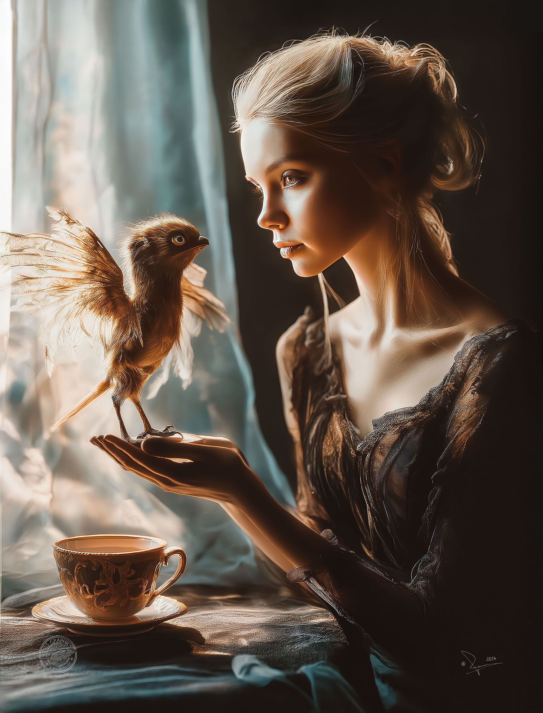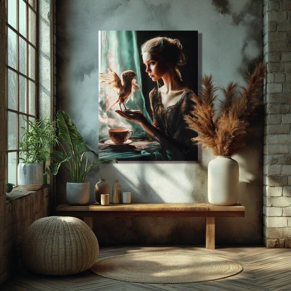 Dieses Leinwandbild strahlt eine zarte, magische Intimität aus. Eine elegante Frau sitzt am Fenster, das sanfte Licht betont ihre anmutigen Züge. Auf ihrer Hand sitzt ein kleiner, gefiederter Fantasievogel, der sie aufmerksam ansieht. Perfekt für Liebhaber märchenhafter Kunstwerke.