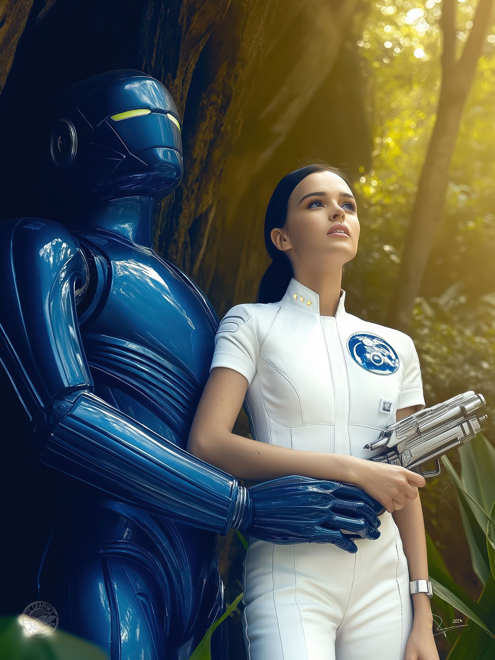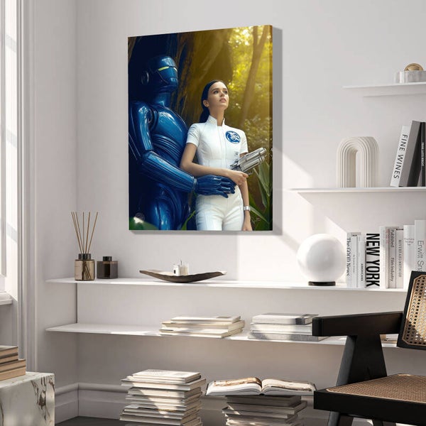 Das Leinwandbild „Der Beschützer“ zeigt eine mutige Weltraumkommandantin in makelloser weißer Uniform, die vertrauensvoll neben einem hochglänzenden, blauen Cyborg steht. Der Roboter steht schützend hinter ihr, während sie in die Ferne blickt, bereit für ein Abenteuer.