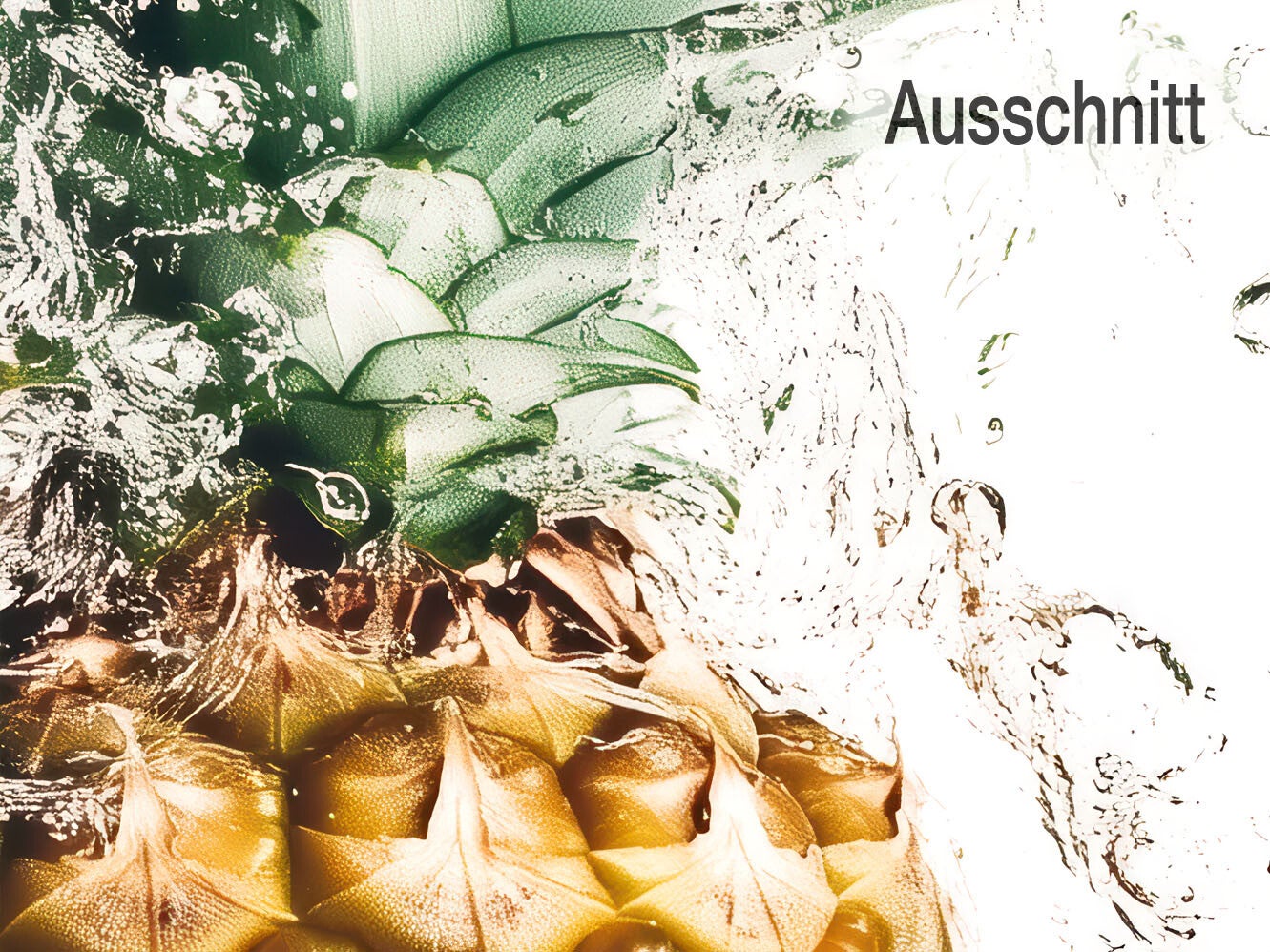 Leinwandbild. Eine Ananas umgeben von spritzendem Wasser vor weißem Hintergrund. Die Darstellung betont Klarheit und Frische. Optisch dynamisch, reduziert und klar strukturiert.